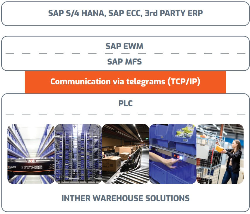 Om een naadloze integratie tussen de material handling equipment van Inther en SAP EWM mogelijk te maken, maakt Inther EWM gebruik van SAP Material Flow System. SAP MFS is een standaard component van SAP EWM die wordt gebruikt om automatische magazijnsystemen direct aan te sturen, zonder tussenliggende software zoals een extern Warehouse Control System. SAP MFS communiceert direct met de PLC van de machinebesturing. SAP MFS maakt gebruik van standaard telegramcommunicatie (TCP/IP) en zorgt voor real-time performance monitoring, fout detectie en een betere synchronisatie tussen magazijnsoftware en hardware.