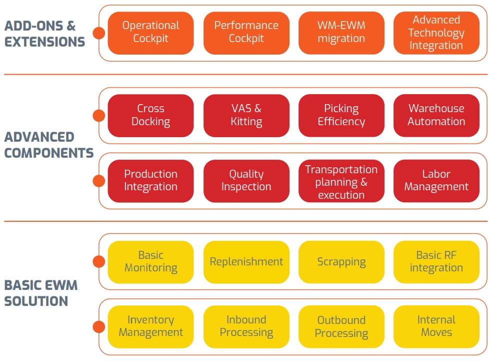 Inther EWM maakt gebruik van een bewezen, standaard projectaanpak, om SAP EWM te implementeren. Op basis van een menukaart worden voorgeconfigureerde processen en integraties op een efficiënte manier geïmplementeerd. De modulair opgebouwde oplossing bestaat uit functionaliteit die ieder warehouse nodig heeft om haar basisprocessen te ondersteunen en geavanceerde componenten, die kunnen worden toegevoegd als daar behoefte aan is. Om het geheel te completeren bevat de oplossing een aantal add-ons en extensies om de operatie en de performance te monitoren en zo nodig de migratie van SAP WM naar SAP EWM te ondersteunen.