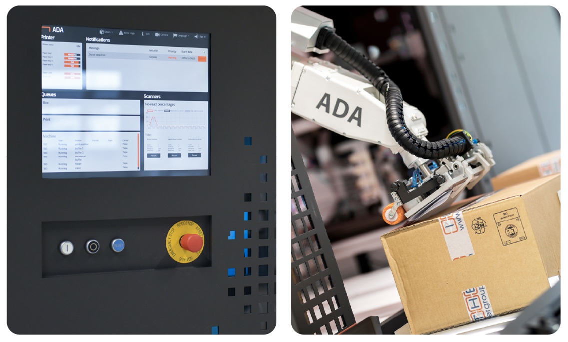 Terwijl een doos naar de machine wordt getransporteerd, wordt deze gescand om te bepalen welke documenten (pakbon, verzendgegevens, enz.) moeten worden afgedrukt en gebufferd. De ADA-machine begint direct met het afdrukken van vooraf gegenereerde verzendbonnen. Meerdere pagina's worden handig gevouwen. Een robotarm neemt de gestapelde documenten en snijdt de documentfolie in één beweging af. De ADA-machine plakt de set documenten op een van de voorgeprogrammeerde posities – aan de zijkant of bovenkant van de doos – afhankelijk van het doostype. De ADA zorgt er altijd voor dat de documenten duidelijk zichtbaar en gemakkelijk toegankelijk zijn aan de buitenkant van de doos.